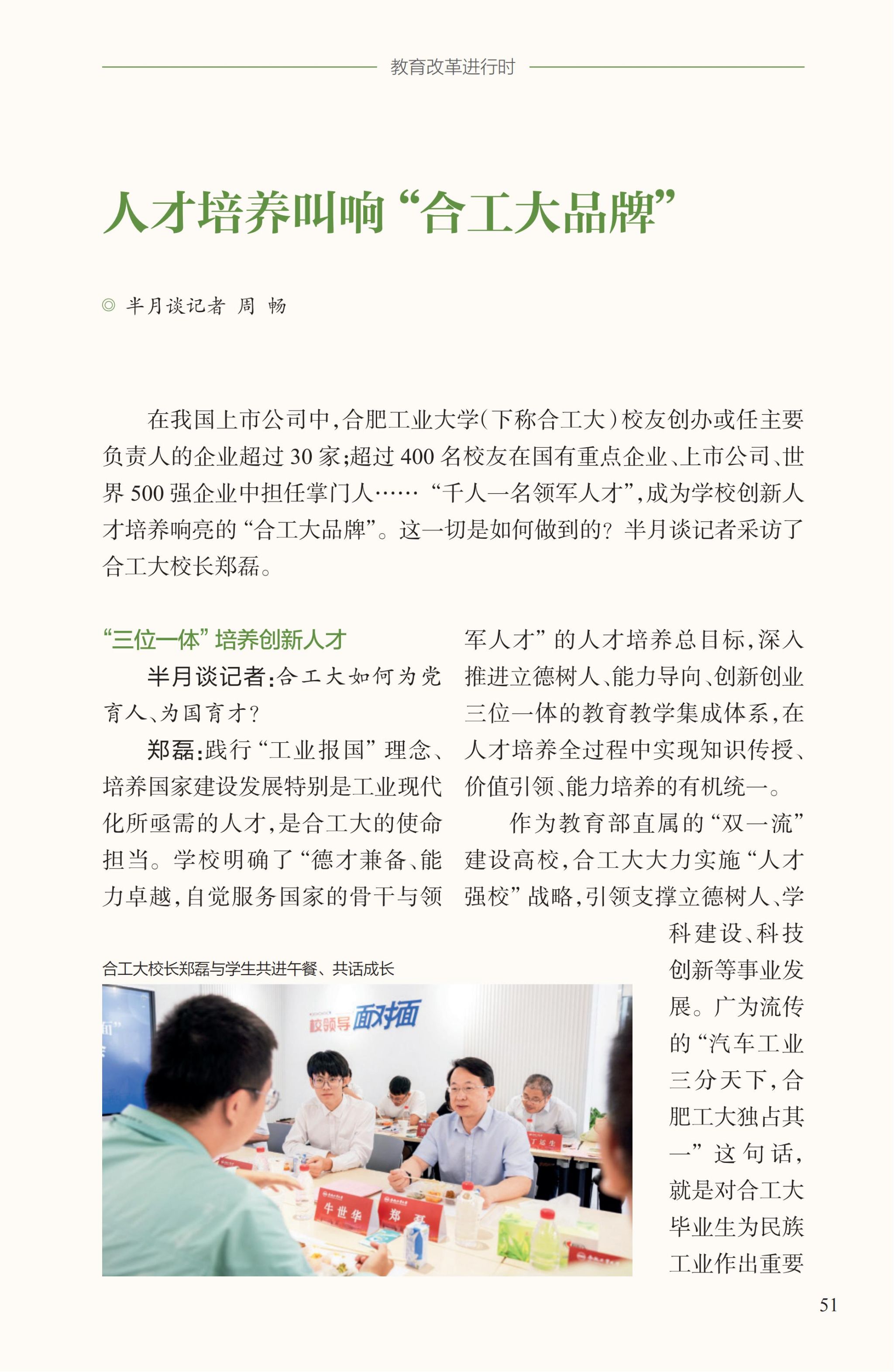 在我国上市公司中,合肥工业大学(下称合工大)校友创办或任主要负责人的企业超过30家;超过400名校友在国有重点企业、上市公司、世界500强企业中担任掌门人……“千人一名领军人才”,成为学校创新人才培养响亮的“合工大品牌”。这一切是如何做到的?半月谈记者采访了合工大校长郑磊。