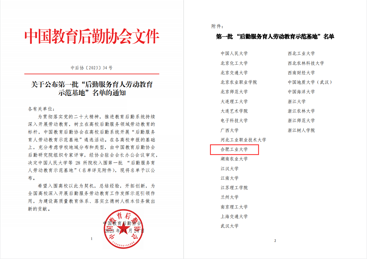 为推进教育后勤系统持续深入开展劳动教育,落实立德树人根本任务,树立高校在后勤服务领域开展劳动教育的标杆,促进形成实践育人、服务育人、文化育人的长效机制,经中国教育后勤协会组织遴选,中国人民大学、合肥工业大学等28所高校入围第一批“后勤服务育人劳动教育示范基地”。