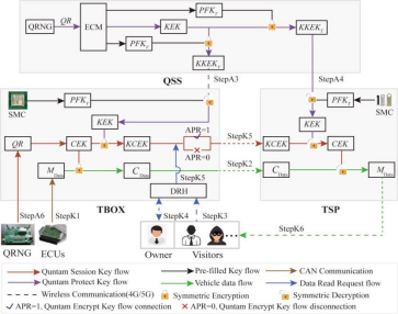 随着车联网与智能交通的快速发展,联网车辆能够获得道路交通监控、紧急事件上报、云辅助自动驾驶等云服务。然而,许多服务是通过不安全的公共信道进行通信,容易受到安全攻击和威胁。针对上述问题,团队提出基于量子密钥的车联网身份认证与密钥协商方法。该方法涉及基于量子随机数(QRNG)芯片车端私有化管理量子会话密钥、基于多层量子密钥结构安全协商量子会话密钥和基于访问角色属性管理隐私数据的共享和公开等关键技术。安全性分析表明,该方法在真实随机(ROR)预言模型下是安全的,满足车联网的安全性要求。性能评估表明,与现有方案相比,方法的计算开销和通信开销分别可降低74.83%—98.59%和28.7%—83.1%。