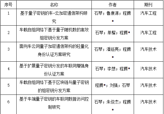 近期,团队依托自动驾驶汽车安全技术安徽省重点实验室、安徽省智慧交通车路协同工程研究中心,在车联网信息安全领域取得了一系列研究成果(表1)。相关成果已发表于《汽车工程》《汽车技术》(车联网量子加密通信技术专题)等期刊,为我校车辆工程专业的建设和发展提供有力支撑。