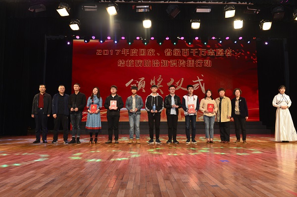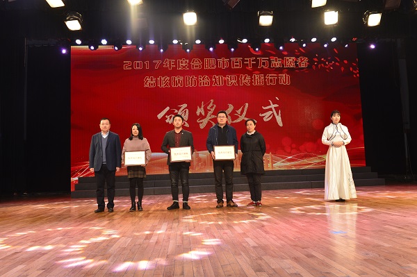 现场,与会领导分别为获得国家、省级及2017年合肥市“百千万志愿者结核病防治知识传播活动”优秀个人和集体颁奖,播放了结核病防治知识宣传短片,还在节目中穿插了结核病防治知识问竞答环节。这些特别环节的设置得到了在场师生的积极响应,同学们热情高涨,争先恐后的抢着答题,将整场演出一次次地推向高潮。