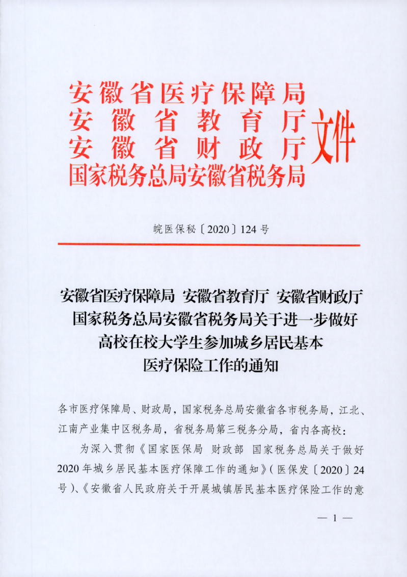 皖医保秘{2020}124号关于进一步做好高校在校大学生参加城乡居民基本医疗保险工作的通知